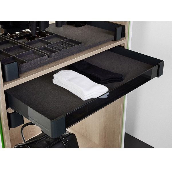 Система хранения Конеро — комплексное решение, которое включает в себя все, что нужно для создания функциональных гардеробных и шкафов купе: полки, пантографы, штанги, брючницы, держатели для ремней, галстуков и наполнение для хранения ювелирных изделий.