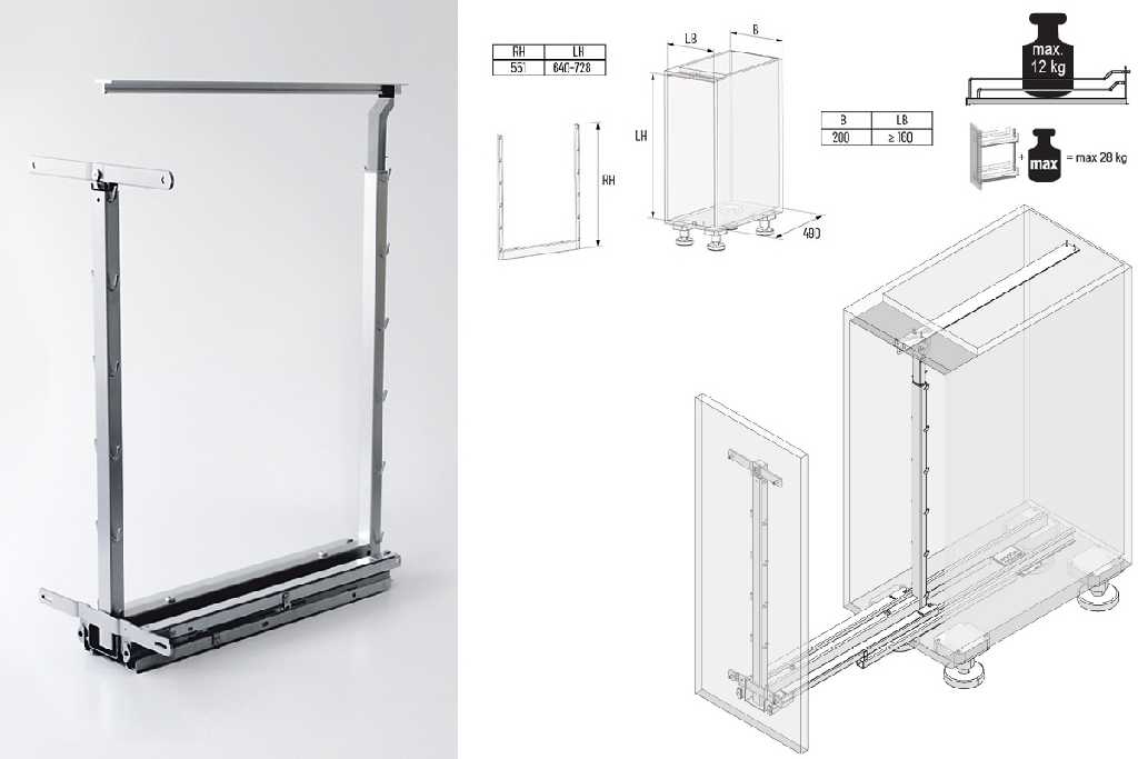 Модульный механизм подходит для организации хранения в нижних шкафах с шириной фасада 200 мм, 300 мм, 400 мм