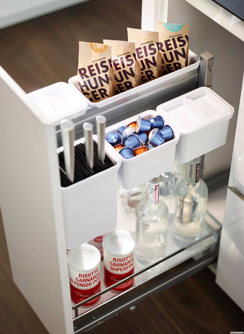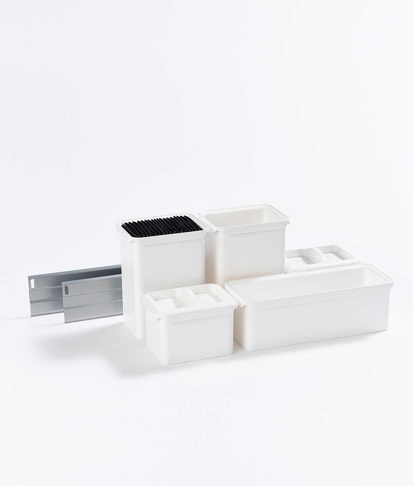 Система хранения Юбокс состоит из разнообразных контейнеров, которые можно приспособить для хранения, ножей, специй, бутылок масла, специй, соусов. У Вас всегда есть возможность установить контейнеры в удобном для Вас порядке и на комфортной высоте. Все контейнеры крепятся на рейке, Вы можете расположить их согласно вашим потребностям.