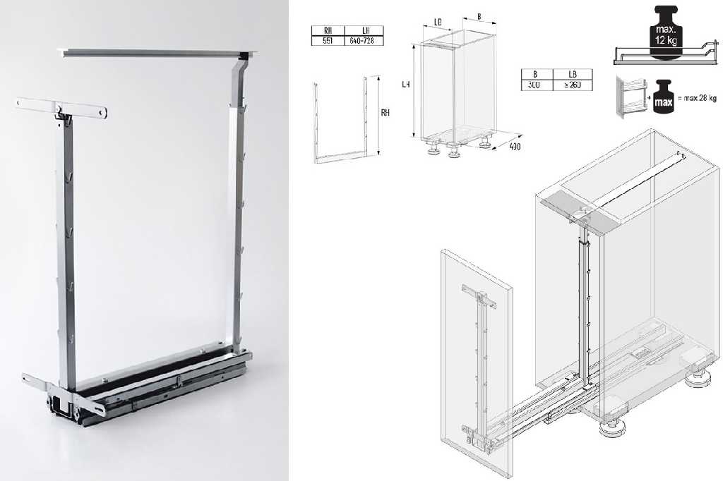 Модульный механизм подходит для организации хранения в нижних шкафах с шириной фасада 200 мм, 300 мм, 400 мм. Система крепится ко дну корпуса и предоставляет доступ с двух сторон.