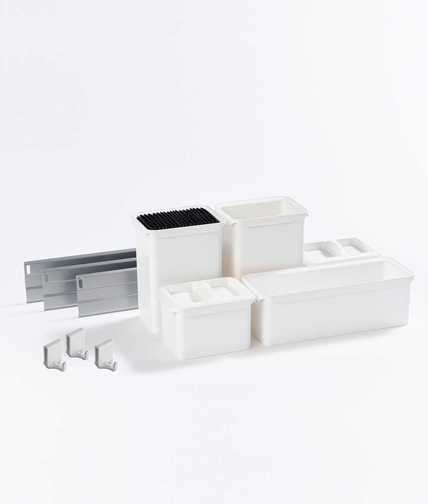 Система хранения Юбокс состоит из разнообразных контейнеров, которые можно приспособить для хранения, ножей, специй, бутылок масла, специй, соусов. У Вас всегда есть возможность установить контейнеры в удобном для Вас порядке и на комфортной высоте. Все контейнеры крепятся на рейке, Вы можете расположить их согласно вашим потребностям.
