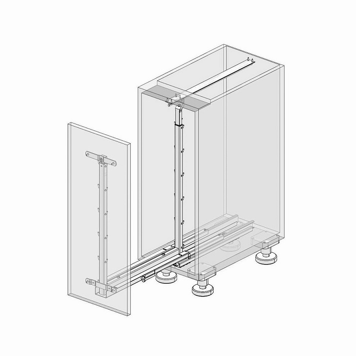 Модульный механизм подходит для организации хранения в нижних шкафах с шириной фасада 300 мм. Система крепится ко дну корпуса и предоставляет доступ с двух сторон.