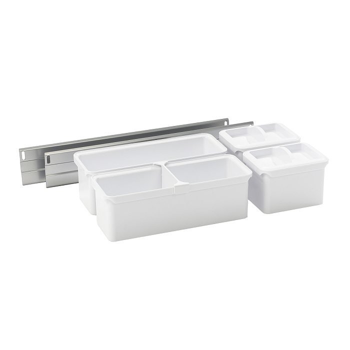 Система хранения Юбокс состоит из разнообразных контейнеров, которые можно приспособить для хранения, ножей, специй, бутылок масла, специй, соусов. У Вас всегда есть возможность установить контейнеры в удобном для Вас порядке и на комфортной высоте. Все контейнеры крепятся на рейке, Вы можете расположить их согласно вашим потребностям.