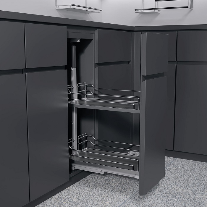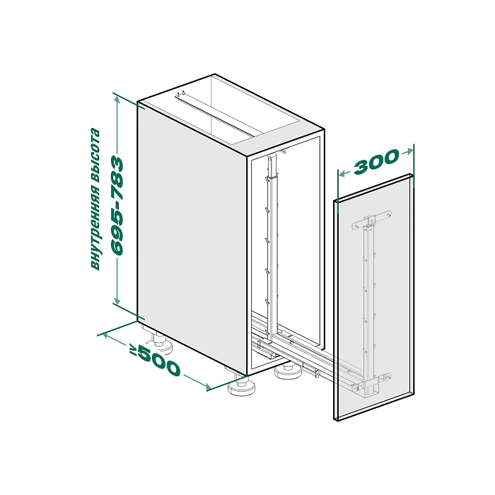 Модульный механизм подходит для организации хранения в нижних шкафах с шириной фасада 200 мм, 300 мм, 400 мм.