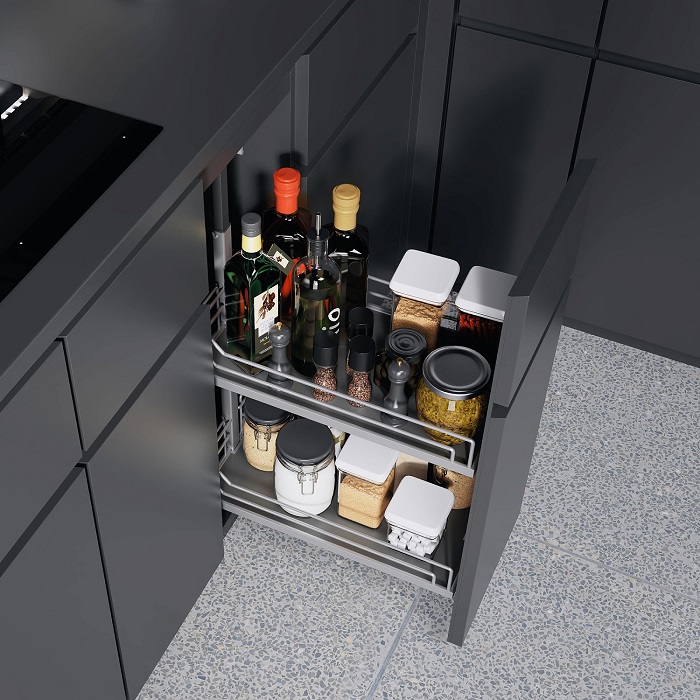 Модульный механизм подходит для организации хранения в нижних шкафах с шириной фасада 200 мм, 300 мм, 400 мм.