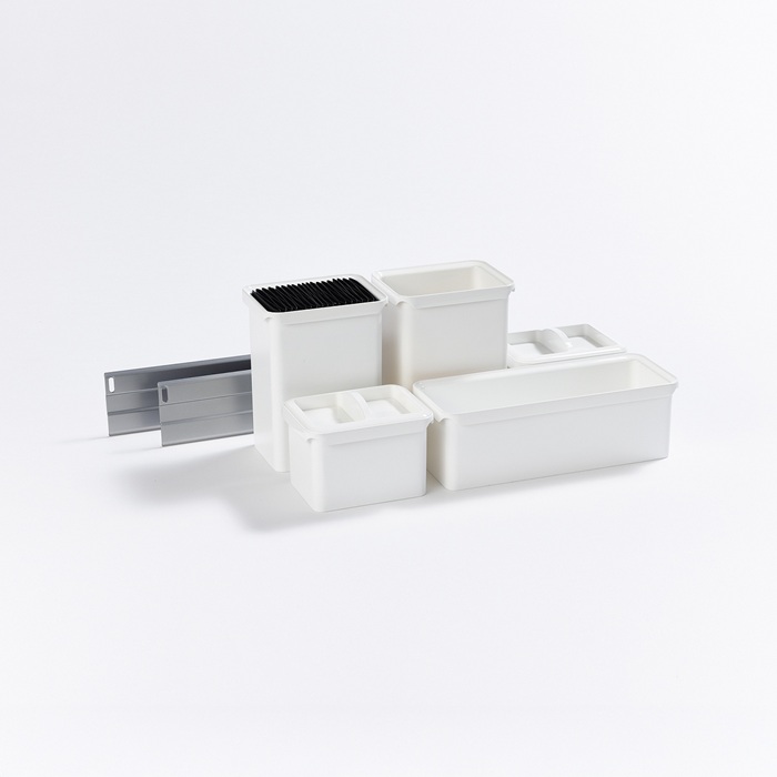 Система хранения Юбокс состоит из разнообразных контейнеров, которые можно приспособить для хранения, ножей, специй, бутылок масла, специй, соусов. У Вас всегда есть возможность установить контейнеры в удобном для Вас порядке и на комфортной высоте. Все контейнеры крепятся на рейке, Вы можете расположить их согласно вашим потребностям.