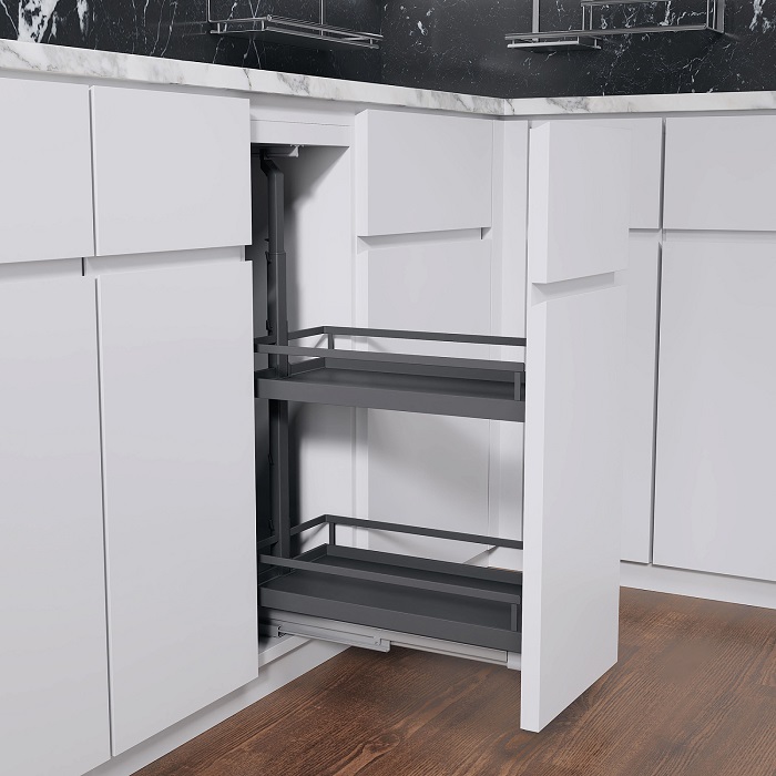 Модульный механизм подходит для организации хранения в нижних шкафах с шириной фасада 200 мм, 300 мм, 400 мм.