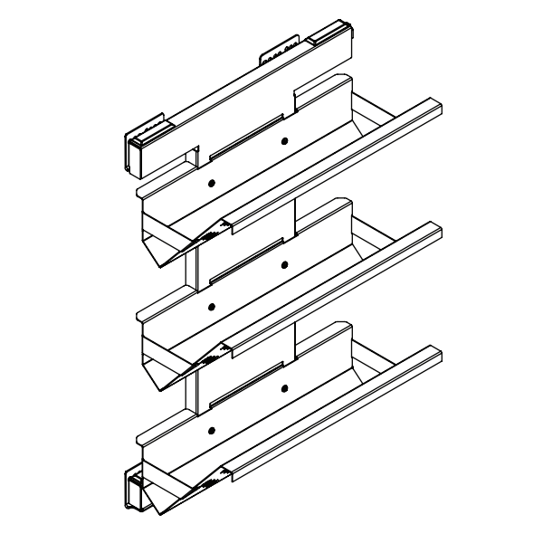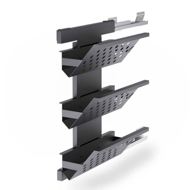 Основой наполнения – являются телескопические по ширине выдвижные рамки, которые встраиваются в корпус шкафа или гардеробной, рамки комплектуются направляющими GRASS Dynamic pro xp, и имеют максимальную нагрузку 45 кг. Система подразумевает установку в рамки большого числа аксессуаров, таких как подвесная корзина, брючница, корзина для белья, обувница и т.д.