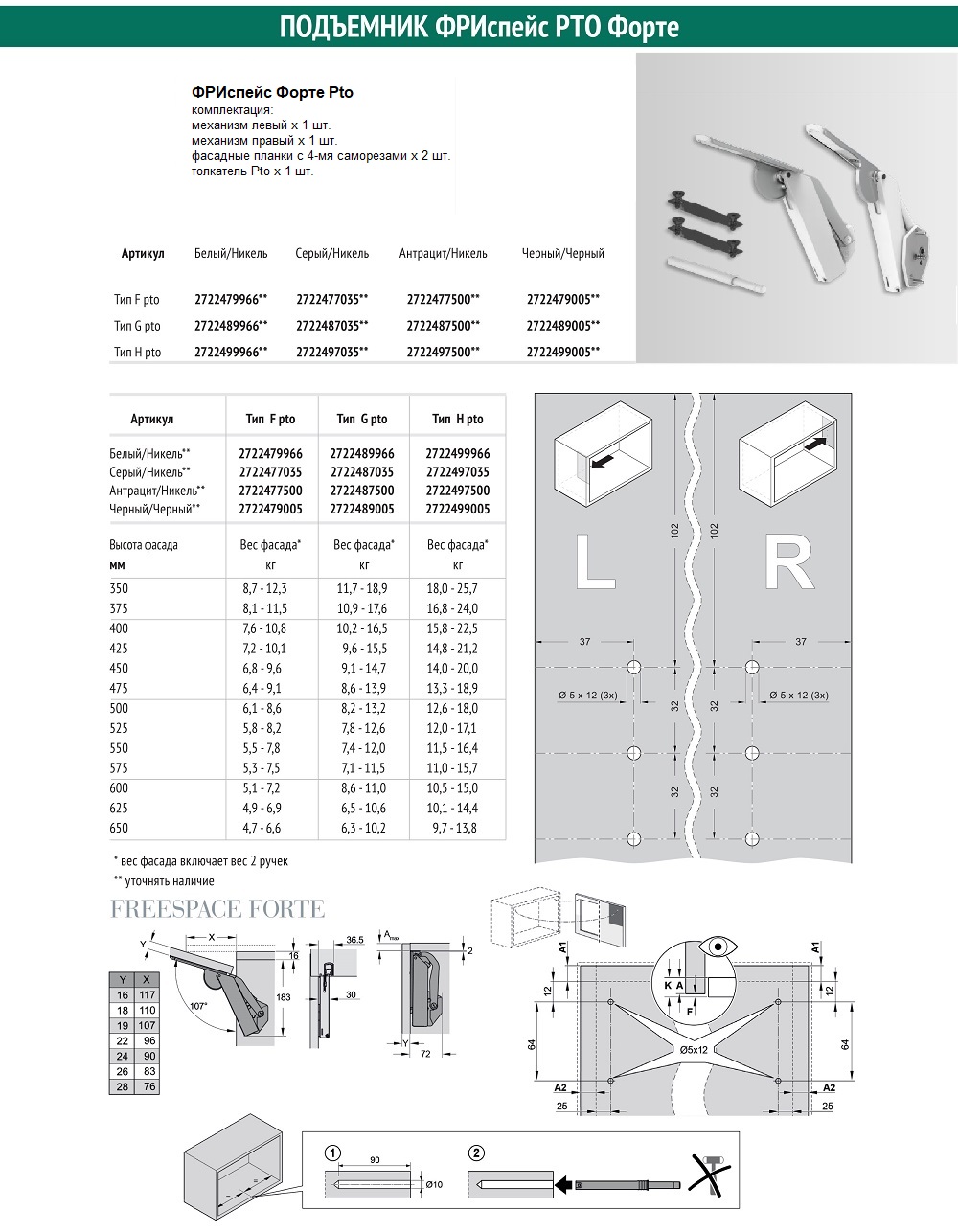 ФриСпейс Форте - это стильный, максимально надежный, компактный и при этом очень мощный подъемный механизм, разработанный для фасадов весом до 25,7кг и высотой от 350 до 650 мм.