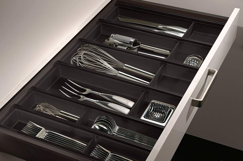 Элегантные лотки для современной кухни: алюминиевый профиль и высококачественный тонированный пластик. Гигиеничный, легкий в уходе материал. Лотки можно мыть в посудомоечной машине при t до 50°C. Поперечные перегородки передвигаются и устанавливаются в размер хранимых предметов. 2 варианта установки лотка: на всю ширину ящика или частично. Для установки лотка на полную ширину ящика в комплект включены 2 уплотнительных профиля, которые фиксируют лоток между боковыми стенками ящика и предохраняют их от царапин. За счет использования профилей ширина лотка увеличивается на 5 - 20мм. Лоток также можно устанавливать в ящик большей, чем указано в наименовании, ширины. В этом случае необходимо доукомплектовать лоток профилем-боковиной (одним или двумя). Боковина закроет торец лотка, а ее силиконовое основание обеспечит устойчивость лотка в ящике.