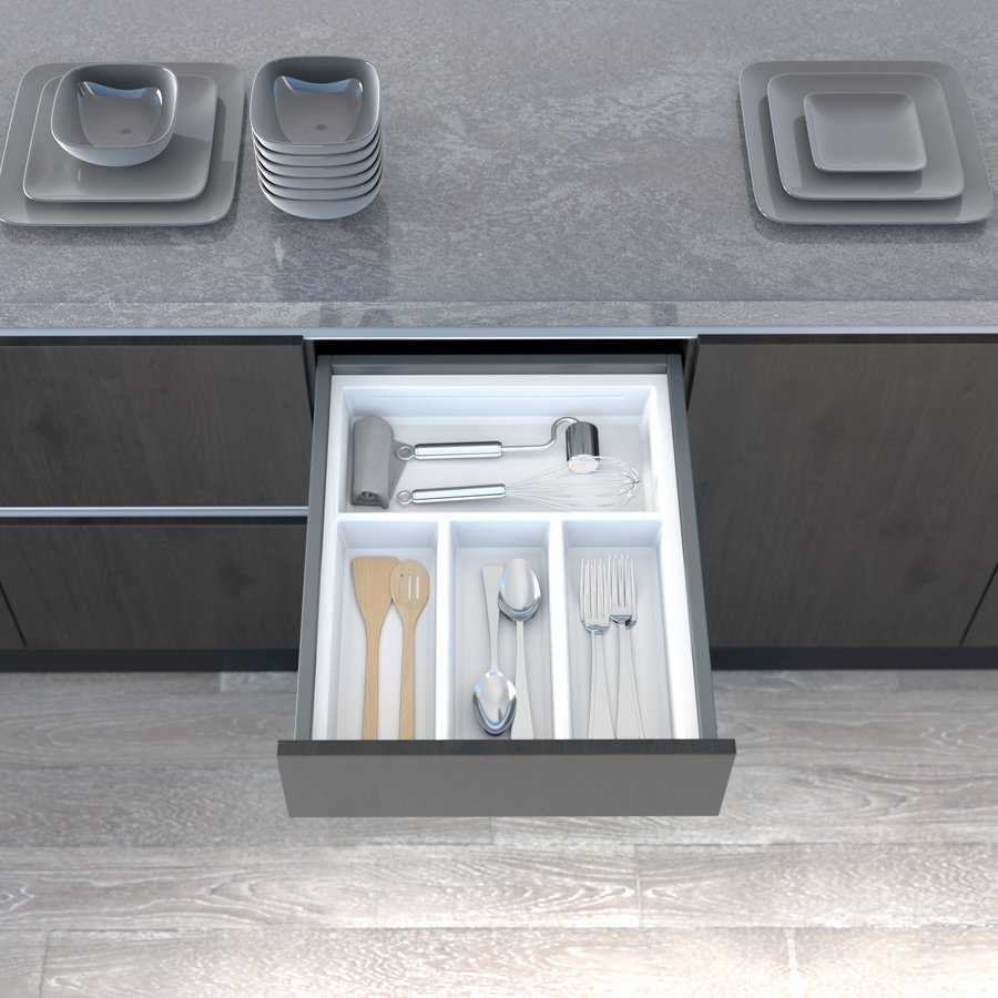 Лотки для приборов не требуют специального ухода: для удаления загрязнений их достаточно протирать влажной тряпкой или губкой. В качестве дополнительных аксессуаров предлагаем комплекты разделителей для лотков, которые позволят организовать систему хранения под индивидуальные потребности.