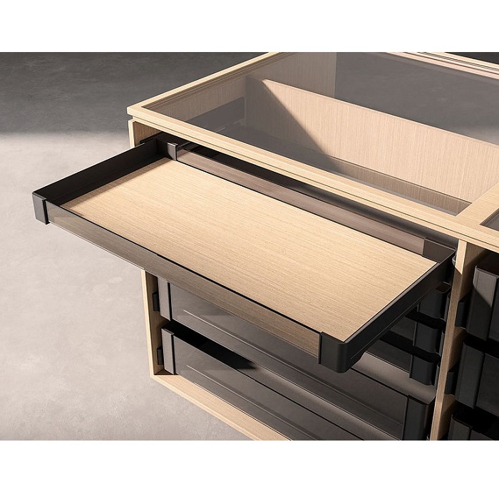 Полки полностью выдвигаются, обеспечивая удобный доступ и обзор содержимого. Тонкие боковины имеют 2 типоразмера, 168 и 72 мм высотой, позволяя хранить разные вещи: от объемных свитеров, до тонких маек.