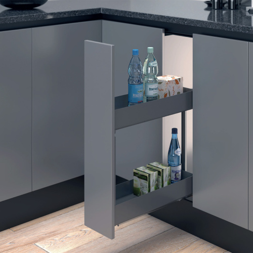 Выкатные корзины для кухни новой серии TWINS. Корзины этой серии выполнены из стали в соответствии с модными тенденциями в современном кухонном дизайне. Трендовая отделка «орион серый» подчёркивает строгий и практичный стиль изделий.