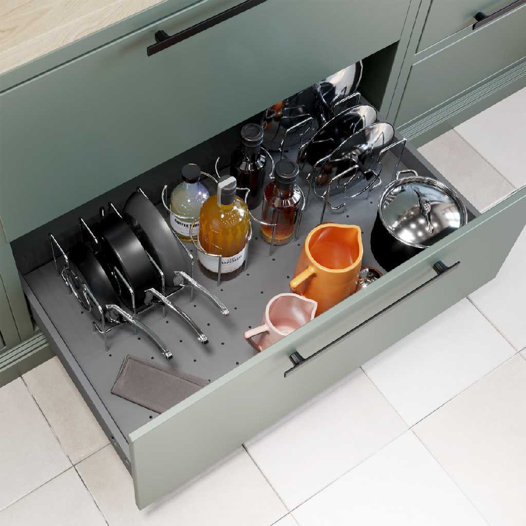 Это эстетичные вкладыши для организации рационального и удобного хранения посуды и утвари в выдвижных кухонных ящиках. Они используются в комплекте с металлическими вставками – держателями для размещения сковородок, крышек и бутылок.
