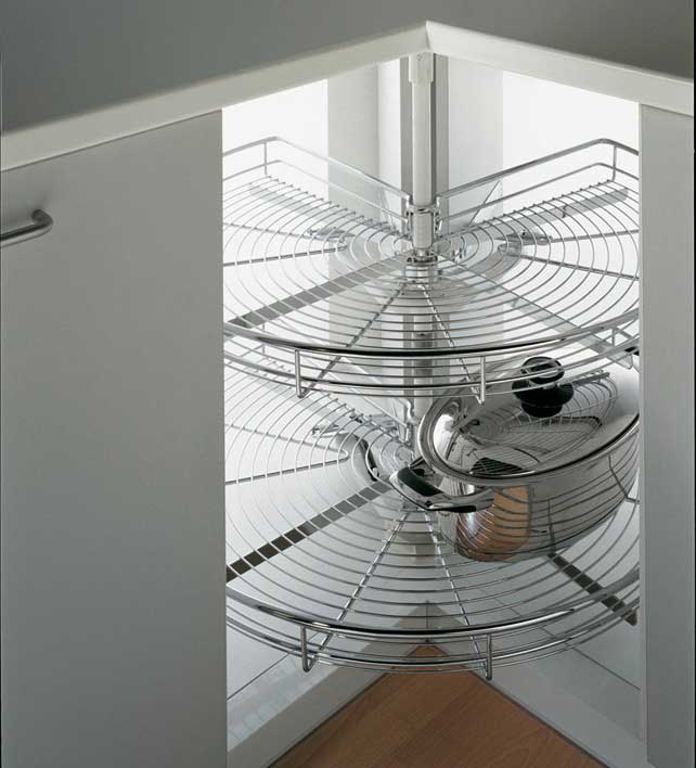 В угловых и П-образных гарнитурах углы используются часто не эргономично. Исправьте это, установив карусель или чудо-уголок. В таком случае вы сможете эффективно использовать пространство, а также легко доставать оттуда все необходимые вам предметы. Угол поворота карусели составляет 270°, а чудо-уголок полностью достаётся изнутри. Он может крепиться к фасаду, и вытягиваться при открытии двери, а также быть представлен двумя отдельными полками или соединёнными вместе, которые вы будете доставать вручную.