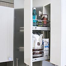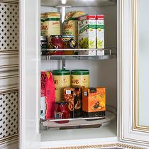 Главное правило – держать специи в зоне быстрого доступа, но не на виду. Хорошо, если в кухне есть возможность выделить для этого отдельную зону: выдвижной ящик под рабочей поверхностью, встроенную колонну между плитой и шкафом или полку с дверцей.